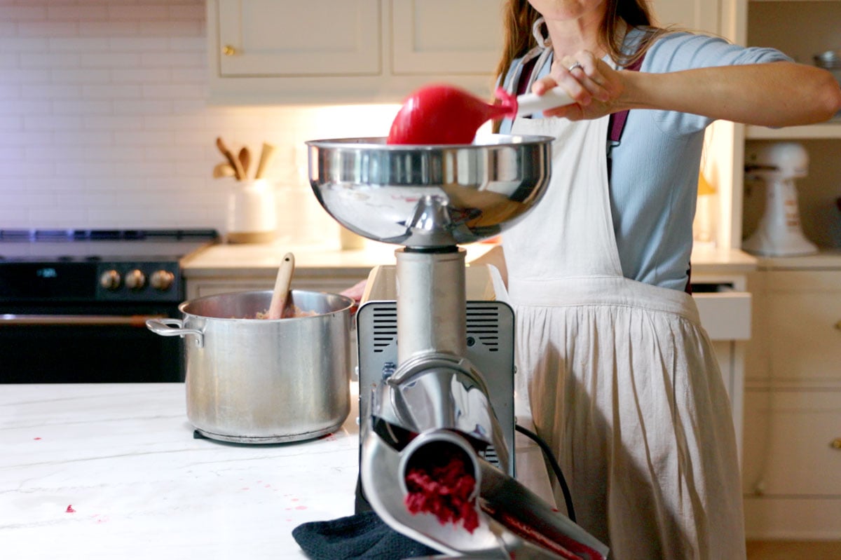 STEP 3: Transfer the cranberry mixture to a food mill or sauce maker to remove skins. Alternatively, blend in a blender until completely smooth.