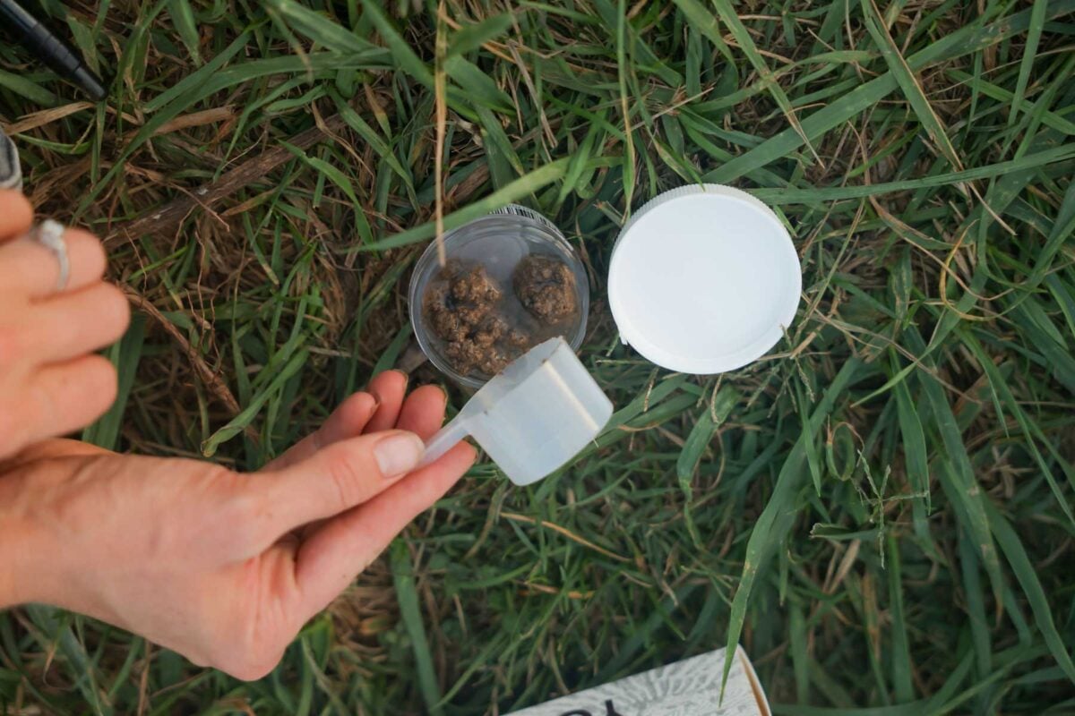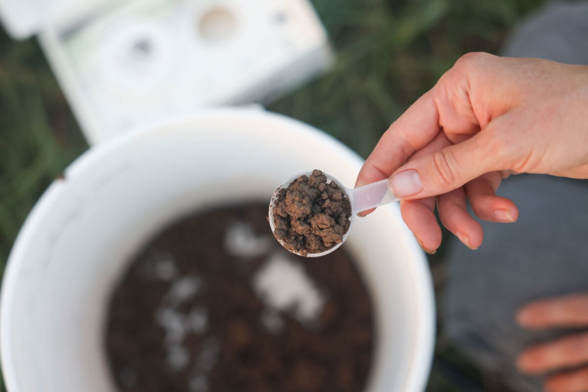 Using the provided scoop, collect one level scoop of the mixed soil and add it to the jar containing DI water and the nutrient absorbing capsule. Tightly secure the lids! DON’T DUMP THE WATER OUT OF THE JAR.