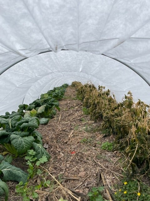 Survivors included everything in my caterpillar tunnel (spinach, lettuce, carrots, turnips, radishes, broccoli) along with most of the cool season crops that were covered. Cabbages, rutabaga, beets, carrots, green onions, and asian greens look great.
