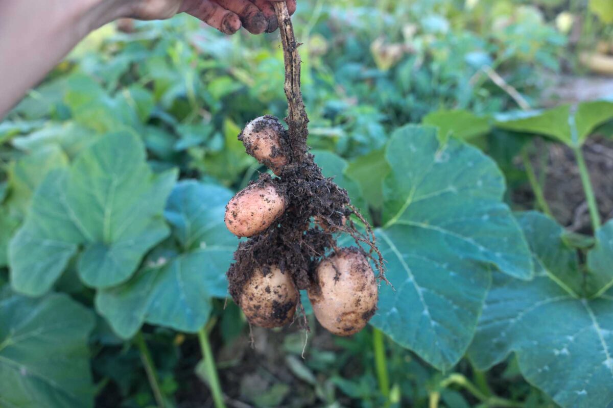 The majority of damage to potato plants happens when you dig too close to the center of the plant. Start digging at least 12-14 inches outside the stem.